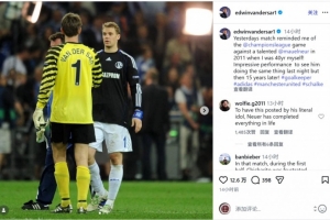 传奇门将范德萨社媒晒出昔日与诺伊尔交手的合照,配文:“昨天的比赛让我想起了2011年在欧冠赛场对阵才华横溢的诺伊尔,当时我自己也40岁了!昨晚看到他奉献与当年同样出色的表现,但时间已经过去了15年,真是令人印象深刻!”